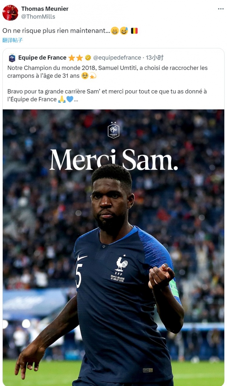 法国中卫乌姆蒂蒂告示退役,法国队社媒发文致意,穆尼耶转发这条动态,玩弄说念:“当今咱们(比利时)再也无谓记挂了😁😅”