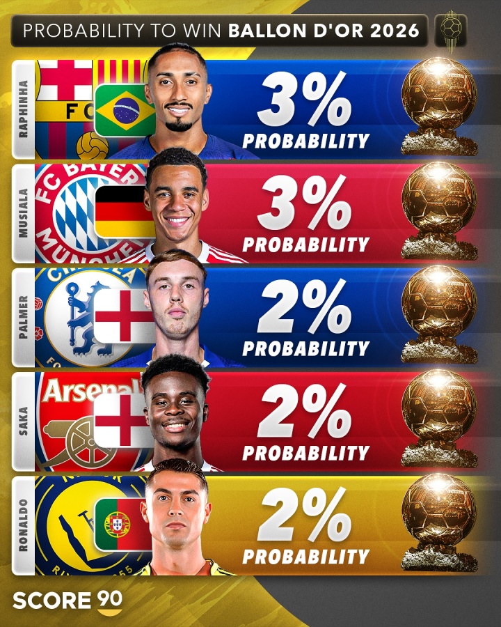 🏆外媒列2026金球概率:亚马尔18%领跑,姆巴佩17%,登贝莱5%