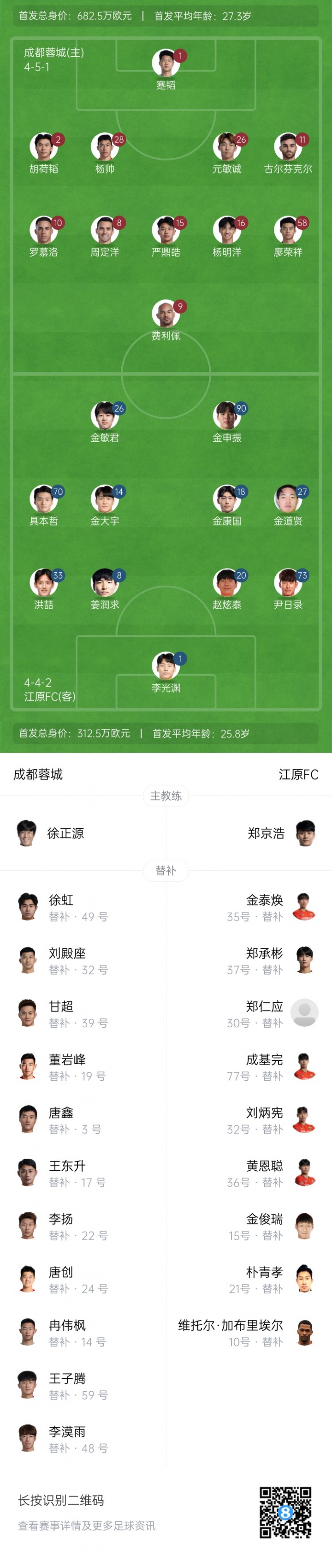 江原FC首发:1-李光渊、20-赵炫泰、33-洪喆、8-姜润求、14-金大宇、18-金康国、70-具本哲、26-金民俊、27-金谈现、73-尹日录、90-金信珍