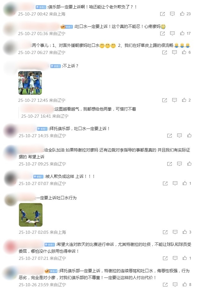 特谢拉的活动,引起英博球员的动怒,还是被换下场的朱鹏宇为此冲进场内,被主裁出示第二张黄牌并红牌罚下。比赛收尾后,大连球迷在官博驳斥区留言,但愿俱乐部上诉特谢拉存在吐涎水的坏心活动。