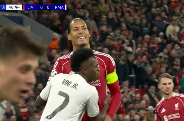 这是追究的吗?1米76维尼修斯角球盯防1米95范戴克,两东谈主嘻嘻哈哈