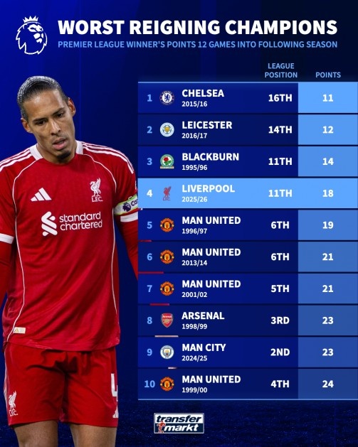 11月24日讯 利物浦在本轮英超焦点战主场0-3完败诺丁汉丛林,12轮联赛后仅积18分,《转会市集》统计闪现他们亦然同时战绩第4差的英超卫冕冠军。