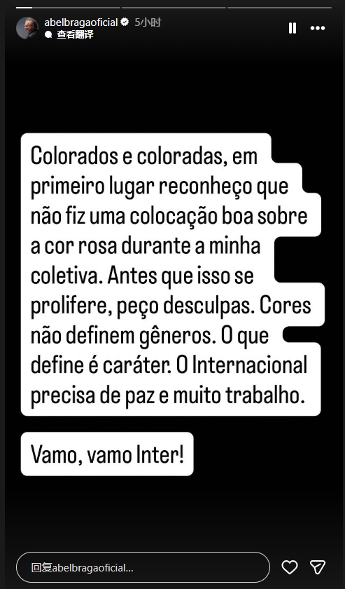 在采访的后半段,阿贝尔讲明,这句话是一句打妙语。但该言论依旧被视为恐同言论,阿贝尔·布拉加随后也在个东说念主社媒INS上说念歉。