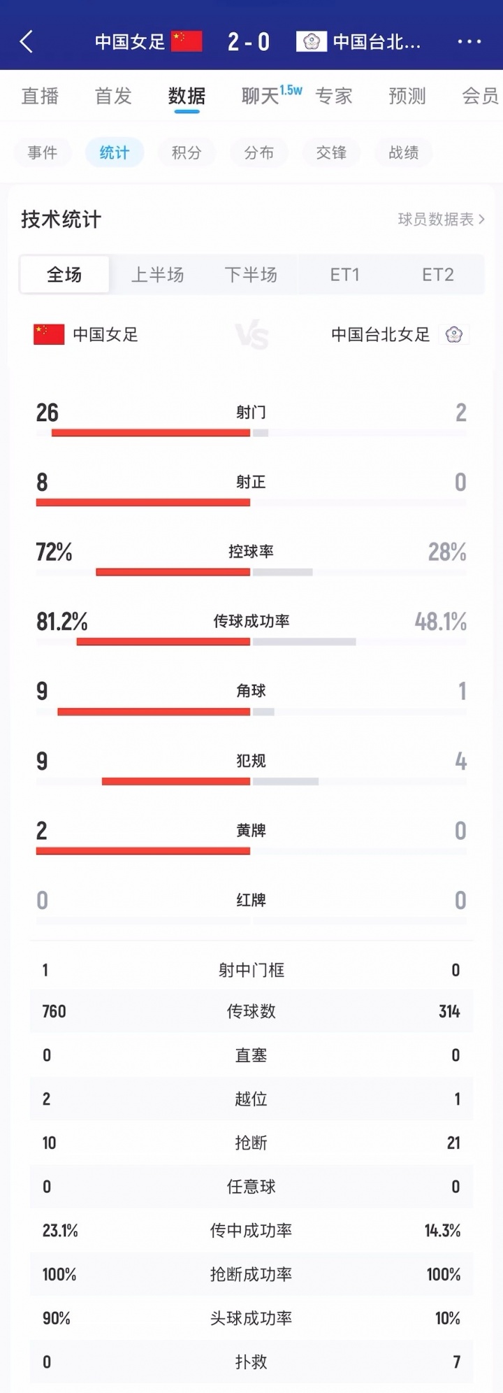 占尽优势!整场数据:中国女足狂轰26射!控技术动作能力术率超7成,被正射0