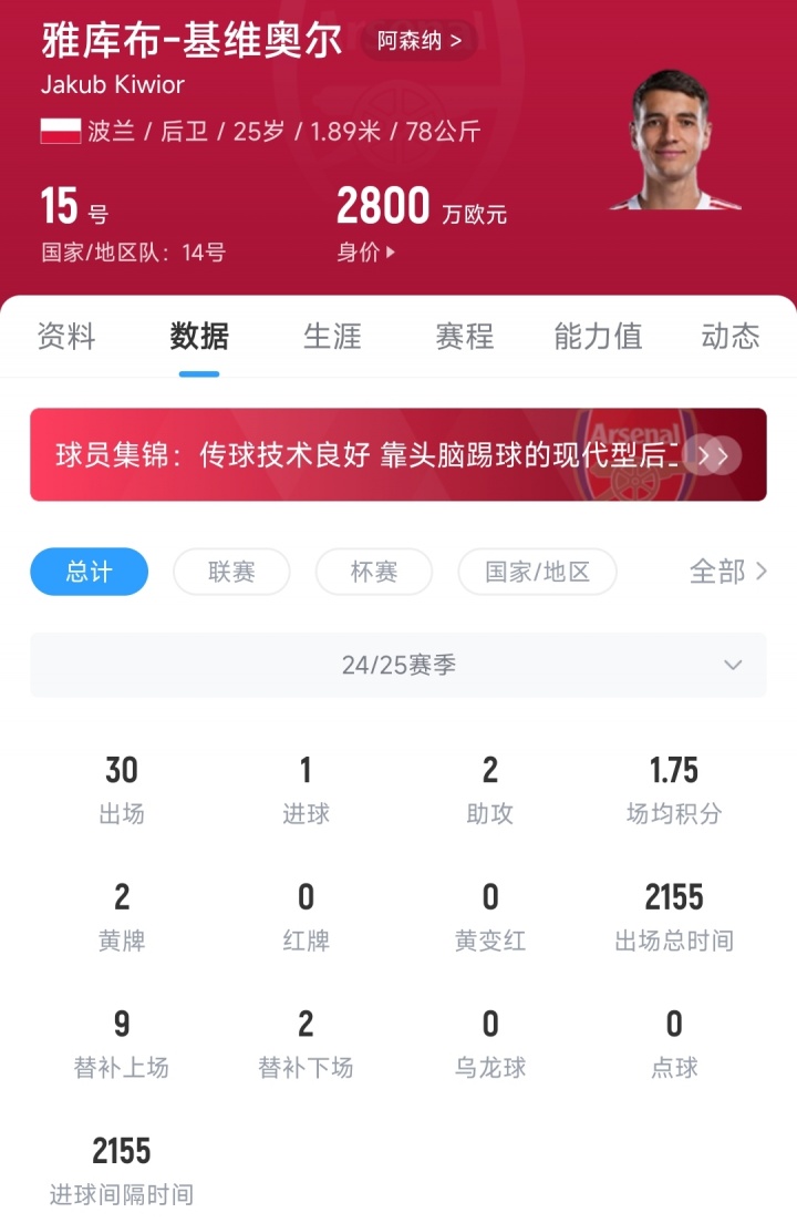 基维奥尔现年25岁,波兰籍后卫,身高1米89。他于2023年冬窗以1950万欧的转会费加盟阿森纳,于今代表枪手各项赛事68场孝顺3球5助攻。