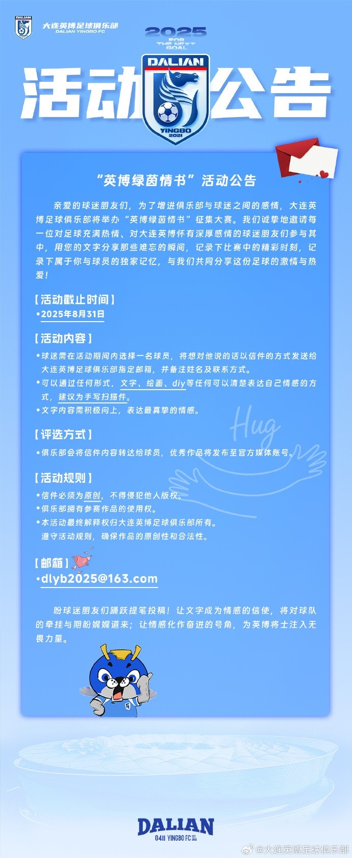 8月28日讯 大连英博官方在七夕前夜发文举办情书动作。