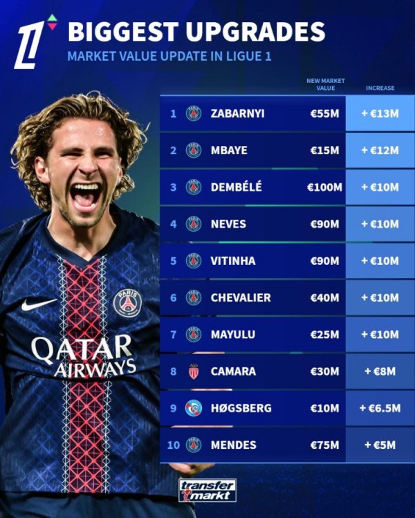 法甲球员身价高潮榜:扎巴尔尼+1300万欧居首,登贝莱+1000万欧
