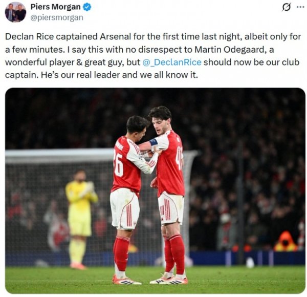 摩根:厄德高很出色,但球队信得过的首级赖斯现时应该成为队长了