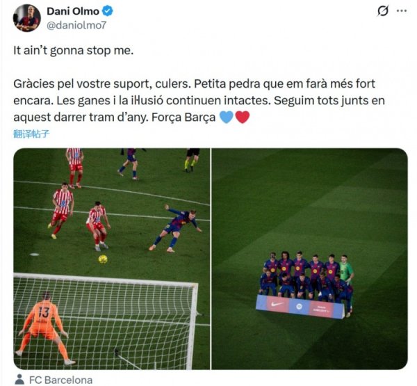 12月3日讯 在西甲联赛3-1逆转马竞的比赛中,巴萨袭击手奥尔莫进球后伤退。赛后巴萨官方通报球员上抢,奥尔莫左肩脱臼,将继承保守融合。 奥尔莫本东说念主在应付媒体发文,为我方饱读劲。奥尔莫上传了我方对阵马竞的进球转眼,以及巴萨全队的合影,并配文写说念:“这庇荫不了我。” “感谢巴萨球迷们的撑抓,这小小的繁重只会让我变得愈加广泛。我的暖热和梦念念也曾如初,让咱们沿途联袂走过本年这临了的阶段,加油,巴萨。”......查看更多