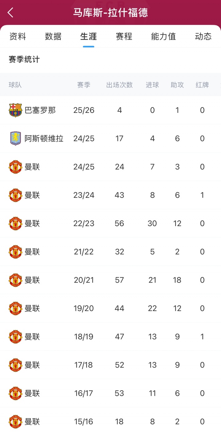 拉什福德近两个赛季进展欠安,上赛季被曼联租出至维拉,今夏再次被外租至巴萨。