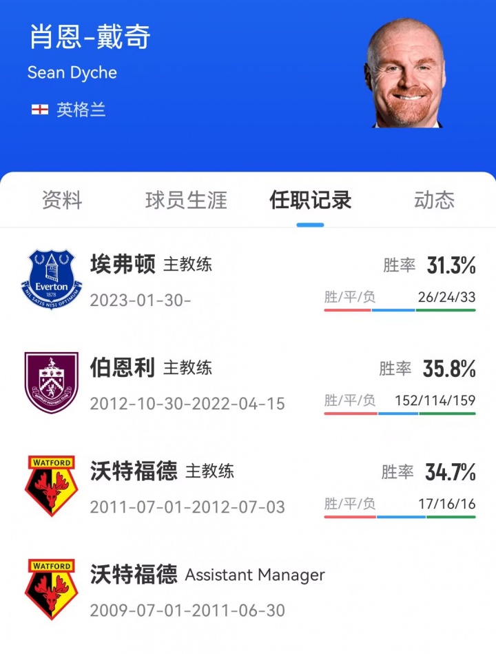 戴奇曾持教沃特福德、伯恩利、埃弗顿,本年1月从埃弗顿下课。
