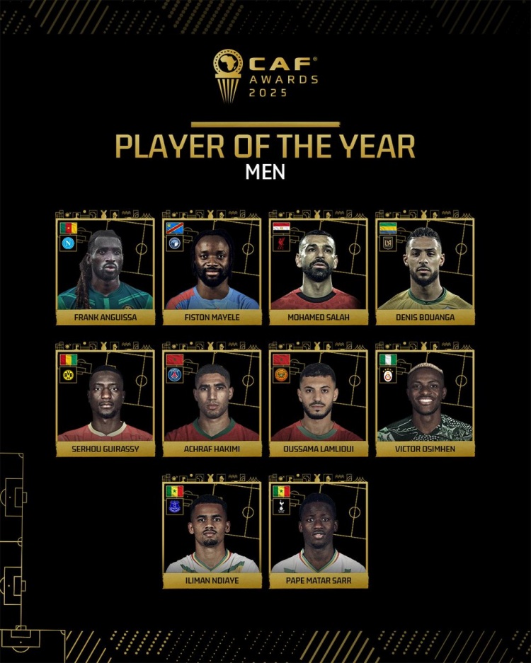 10月22日讯 非洲足球纠合会(CAF)公布2025年度最好球员候选,萨拉赫、奥斯梅恩、吉拉西、阿什拉夫等10名球员获提名。