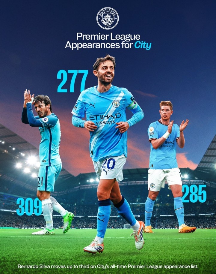 本场比赛亦然B席第277次代表曼城在英超出场,升至队史第三位,仅次于席尔瓦的309场以及德布劳内的285场。