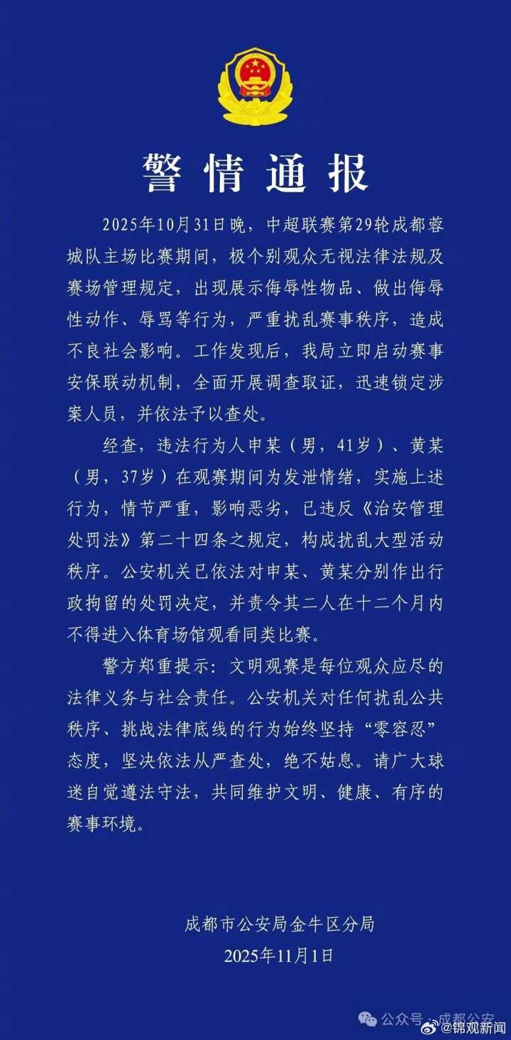 这并不是球迷长短球员的单一事件,2025年10月31日,成皆蓉城主场1-2不敌河南队的比赛中,成皆蓉城部分球迷对河南外助阿奇姆彭作念出学山公叫,长短“黑鬼”+竖中指,这些具有脑怒性、侮辱性的言行,这也酿成了恶劣社会影响。之后成皆公安机关已照章对涉事球迷作出行政拘留的处罚决定,并且成皆蓉城俱乐部遭足协重罚50万+部分看台空场。
