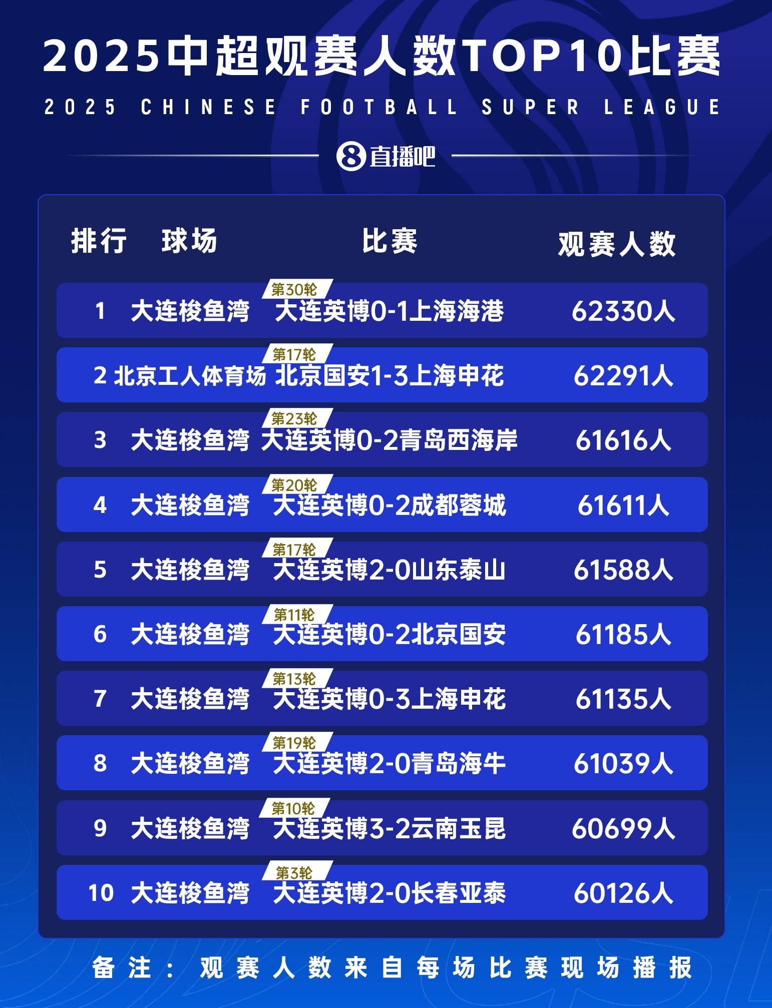 看到这里,要是问你本赛季不雅赛东说念主数TOP10的比赛是哪些场次?这个谜底应该不难猜了,是的大部分是大连英博所创造,本赛季上座前十名比赛其中9场来繁盛连梭鱼湾。大连英博赛季收官战0-1海港的比赛,有62330东说念主涌入梭鱼湾现场不雅战,碎裂了本赛季北京国安1-3上海申花62291东说念主不雅战记录,在临了时分刷新本赛季中超的上座东说念主数记录。
