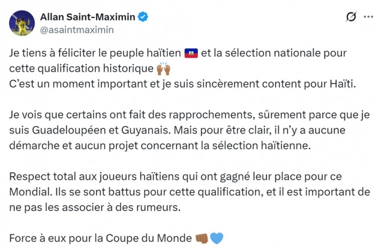 加入海地国度队?圣马克西曼社媒辟谣:莫得这么的打算