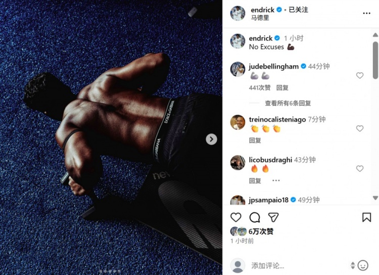 9月5日讯 恩德里克在个东谈主社媒晒出一张我方作念俯卧撑查考的像片,配文写谈:“莫得借口💪🏿”