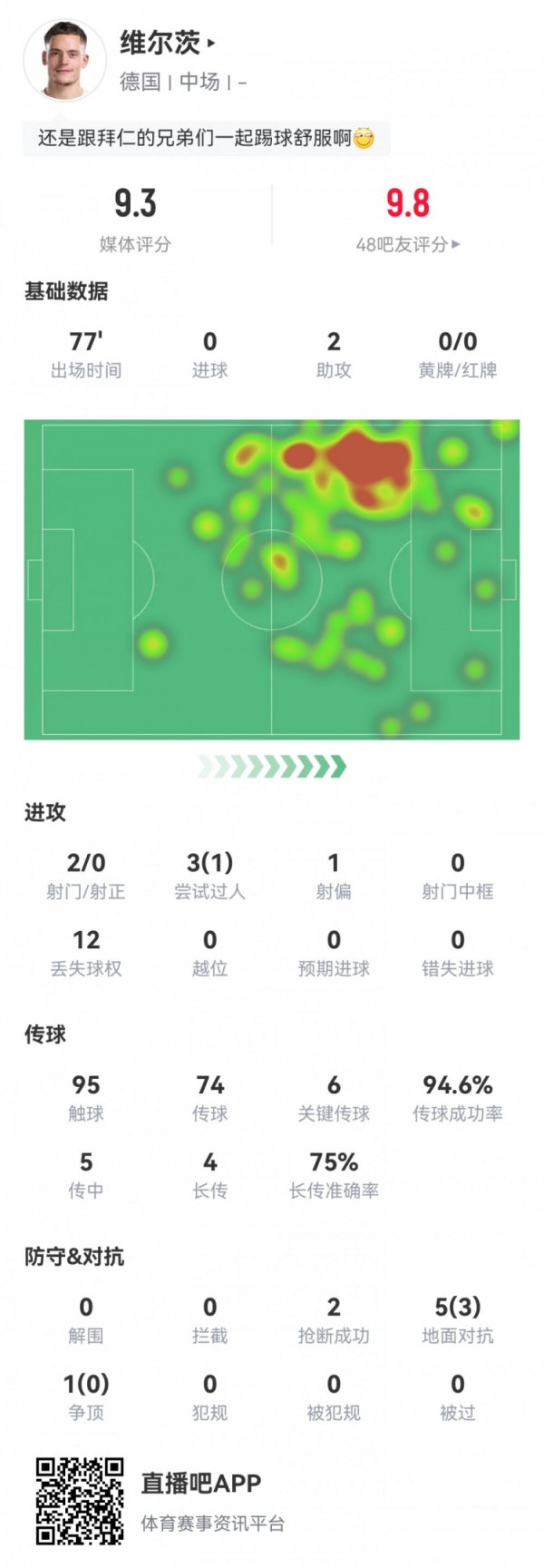 熟练的配方!维尔茨数据:6要道传球2助攻传球得胜率94.6%评分9.3