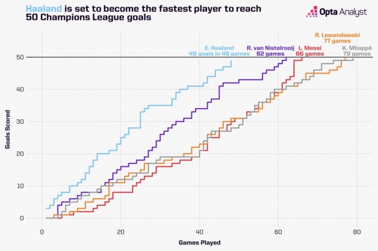 48场49球!哈兰德有望窒碍最快欧冠50球记载