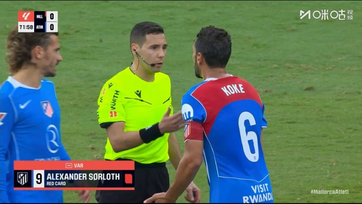 09月21日讯 本日西甲马竞vs马洛卡,比赛第72分钟,索尔洛特亮鞋钉蹬踏,裁判切身看VAR后出直红,马竞少打一东谈主!