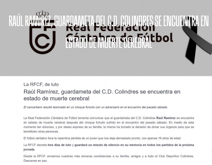 皇家马德里俱乐部、其主席及董事会对科林德雷斯俱乐部19岁的门将劳尔-拉米雷斯的毕命深表悲伤。