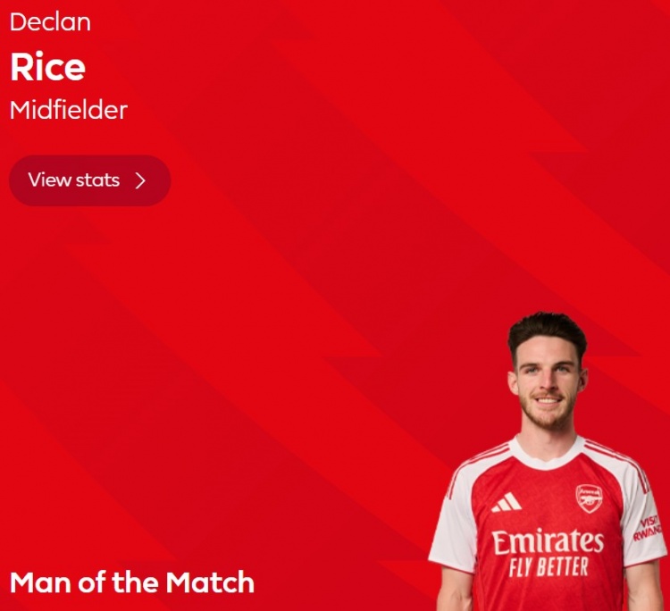 濒临旧主破门,英超官方:赖斯当选阿森纳2-0西汉姆全场最好球员