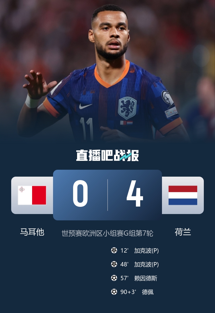 上半场赫拉芬贝赫造点,加克波点射闪击到手,下半场加克波点射完成双响,赖因德斯推射扩大比分,德佩替补立功,最终荷兰4-0马耳他三分领跑。