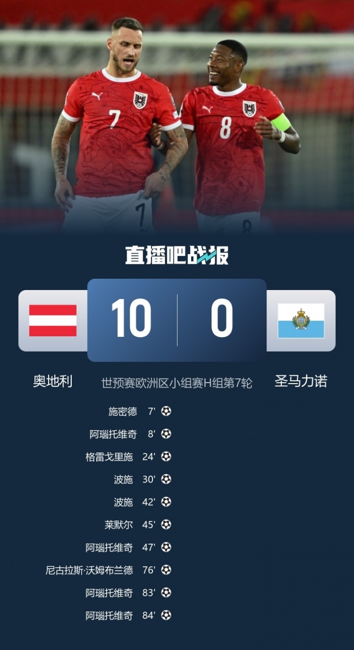 奥地利10-0狂胜圣马力诺,阿瑙托维奇大四喜。奥地利5连胜领跑H组;圣马力诺6连败、只进1球狂丢28球,排行倒数第一。