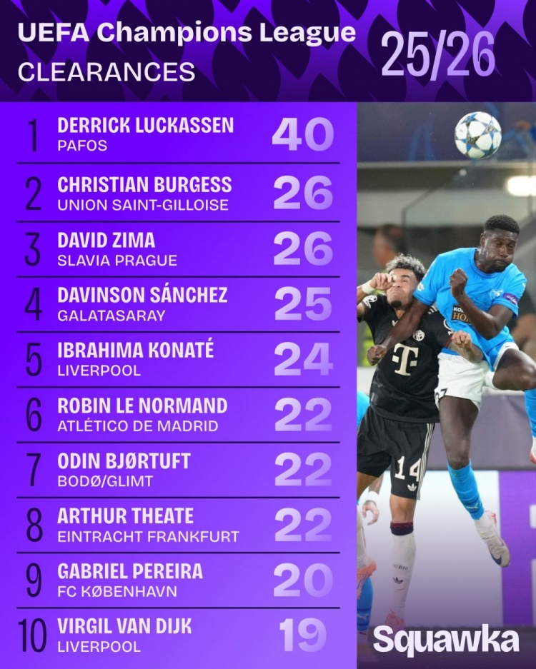 10月23日讯 本赛季欧冠联赛阶段已战罢3轮,Squawka统计了到现在截止的突围榜单。帕福斯后卫卢卡森40次突围断崖式提高,圣吉罗斯后卫布尔格斯和布拉格斯拉维亚后卫皆玛26次分列二三位。