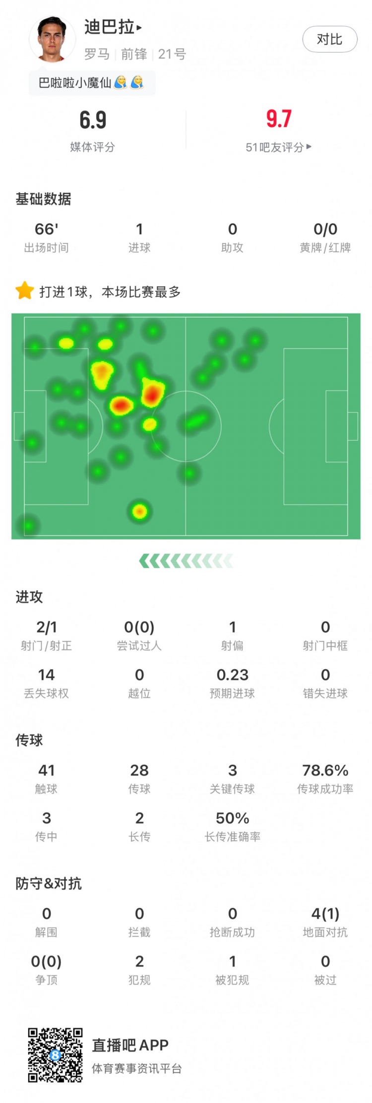 迪巴拉此役为罗马首发出战66分钟,打进1球,同期还送出3记环节传球。