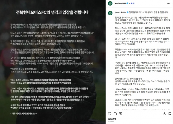 11月25日讯 此前全北当代阿根廷助教拉眼角,被韩国裁判协会禁赛5场,当天全北当代官方发布公告,暗意对这一后果深表缺憾,并将提议上诉,同期助教晓谕离职,将在赛季抵制离队。