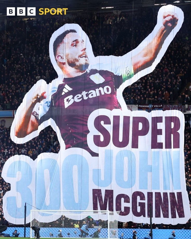 维拉队长麦金迎球队300次出场里程碑,主场球迷制作巨幅TIFO祝福