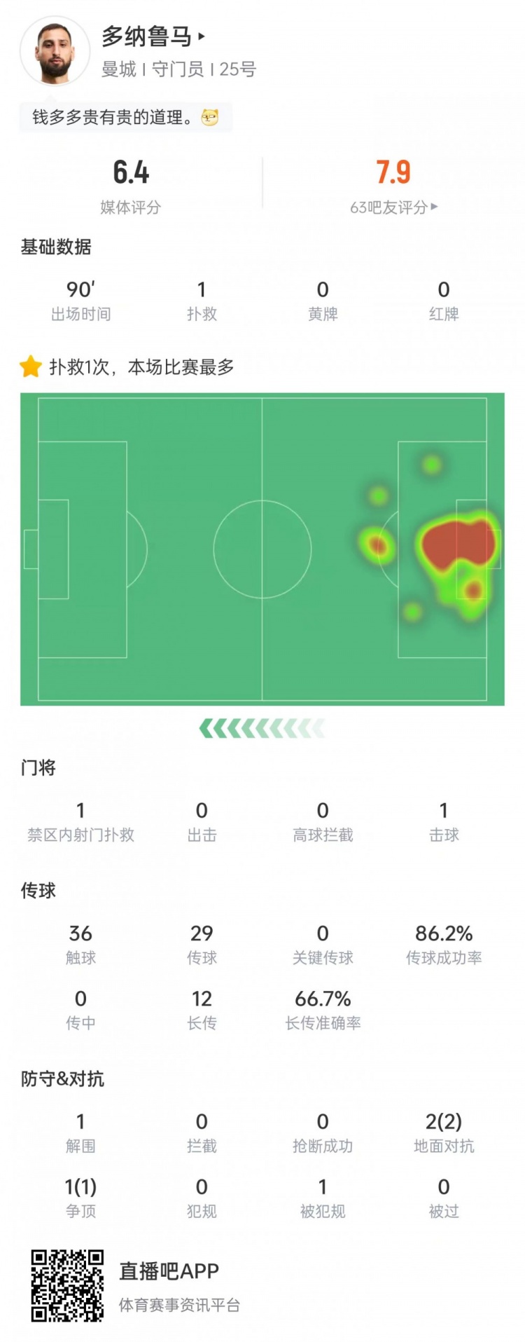 多纳鲁马数据:作念出1次扑救丢4球,长传顺利率66.7%,获评6.4分