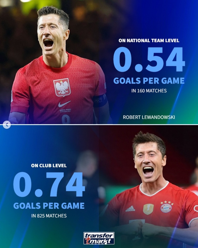 莱万(37岁):俱乐部825场,场均0.74球;国度队160场,场均0.54球