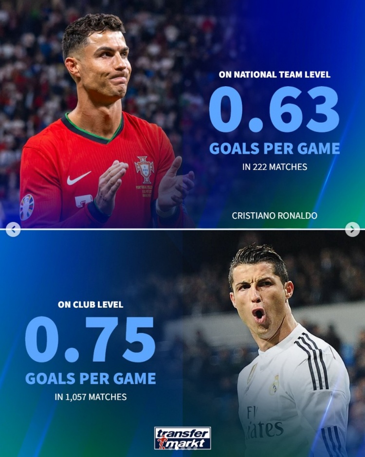 C罗(40岁):俱乐部1057场,场均0.75球;国度队222场,场均0.63球