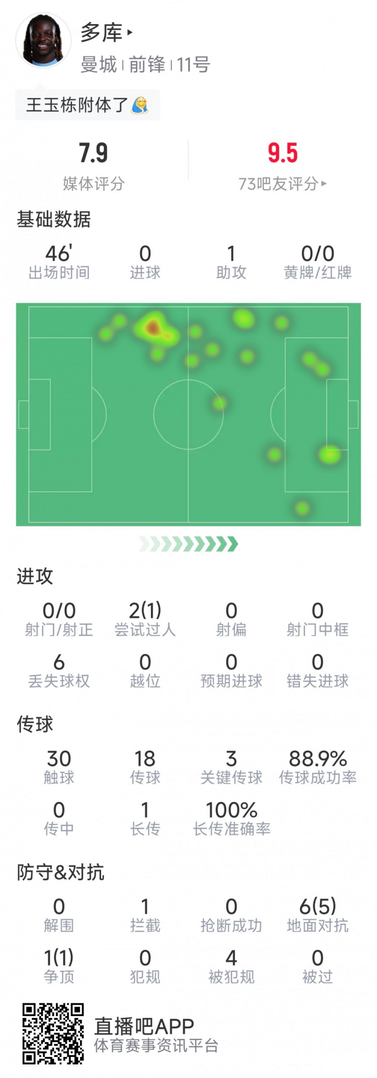多库半场数据:1次助攻,3次要津传球,7次抵御6次成功