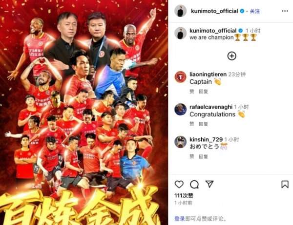 4球16助攻,辽足日本外助国脉宜裕社媒庆祝中甲夺冠:咱们是冠军