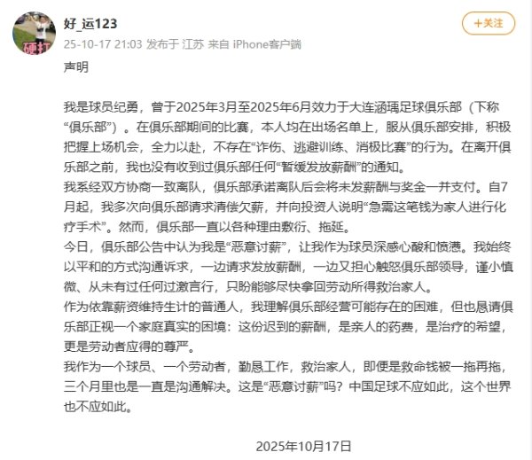 球员纪勇:讨薪为家东说念主进行化疗手术,被大连涵瑀称“坏心讨薪”