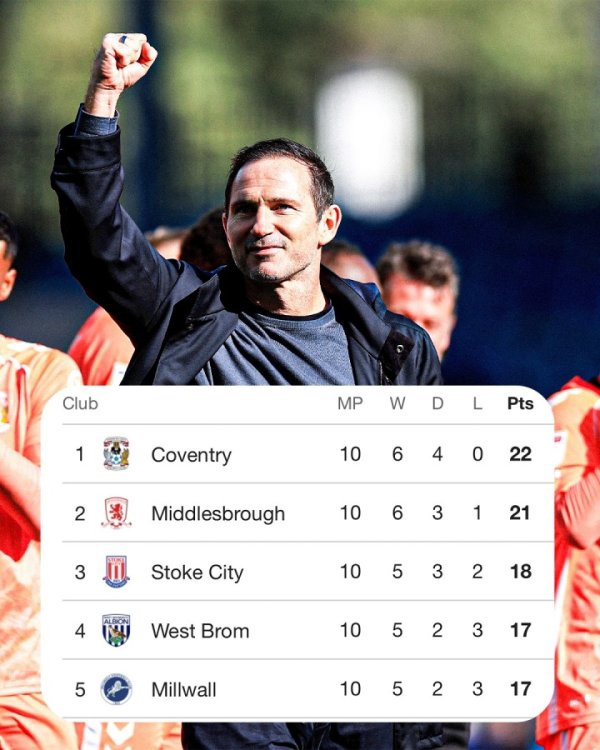 大叫大进!兰帕德率队4连胜0丢球轰14球,考文垂10轮不败领跑英冠