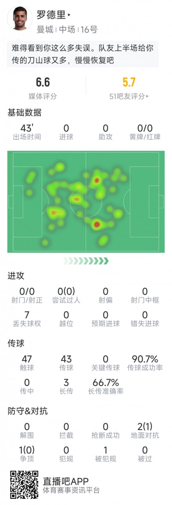 罗德里半场数据:7次丢失球权,3次起义1次见效,无抑遏、抢断