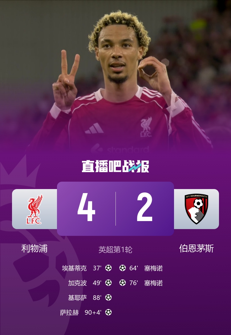 英超第1轮,利物浦4-2伯恩茅斯,基耶萨88分钟绝杀,萨拉赫94分钟锁定胜局!