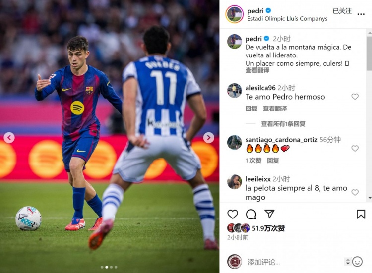 全场最好!佩德里社媒:重返西甲榜首,抖擞一如既往