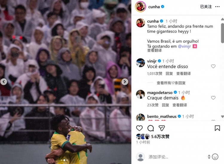 赛后库尼亚也在社媒晒出与维尼修斯庆祝进球的合照,配文写说念:“咱们荒谬忻悦能与这支伟大的球队继续前进,加油巴西队,咱们为你炫夸。与维尼修斯连线破门!”