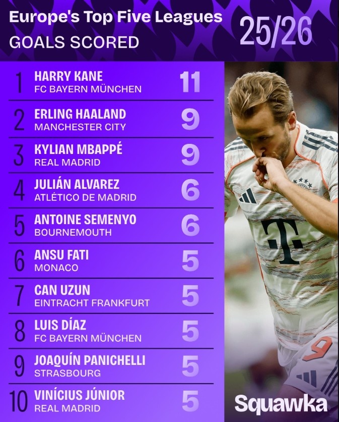 10月17日讯 本周末,欧洲五大联赛将重燃战火。Squawka盘货了本赛季迄今戒指五大联赛进球数情况,凯恩以11球居首,哈兰德和姆巴佩均打进9球紧随自后。