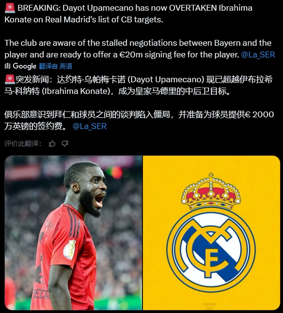 往常几周,科纳特一直被视为“下一位加入皇马的球员”热点东谈主选。他与利物浦的条约将在来岁夏天到期,两边于今莫得进行续约筹议。同期,科纳特已在熟识西班牙语,又与姆巴佩私情甚笃,加盟皇马看上去严容庄容。皇马主帅阿隆索亦把科纳特定为“顶级签约”。法国中卫蓝本详情下赛季将白衣披身,岂料如今的局面发生了天翻地覆的变化。