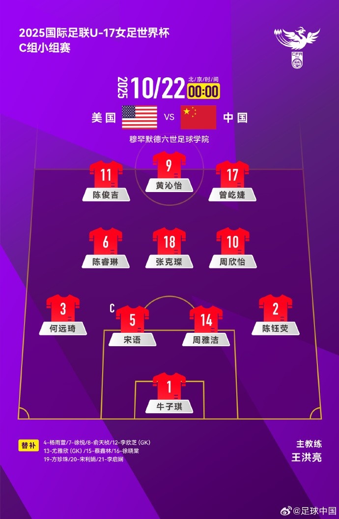 10月21日讯 2025外洋足联U-17女足天下杯C组小组赛第2轮,好意思国队VS 中国队首发名单出炉!