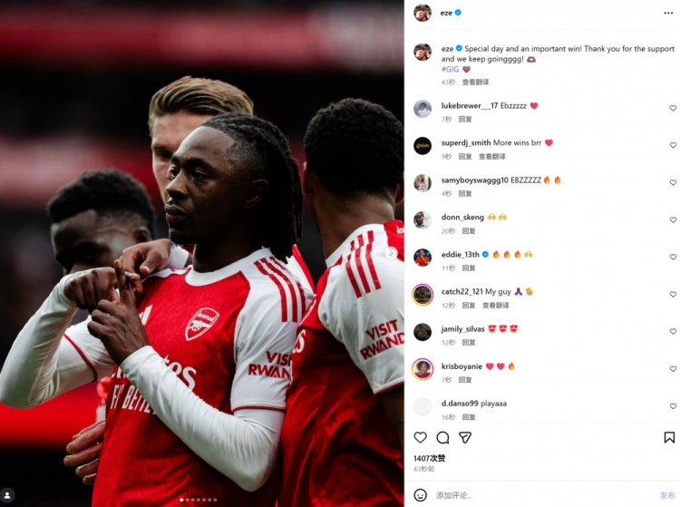 本场比赛埃泽濒临旧主打进制胜球,赛后他在个东谈主社媒晒出庆祝照,配文写谈:“突出的一天拿到一场蹙迫的到手,感谢公共的复旧,咱们不时前进!”