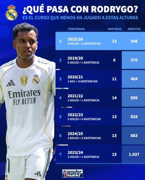 11月8日讯 尽管皇马主帅阿隆索屡次在新闻发布会上强调罗德里戈是球队阵中要紧一员,但数据却表现了透彻不同的情况。在紧要端,只好恩德里克和贡萨洛-加西亚比他出场时间更少。事实上,这是他加盟皇马以来前15场比赛出场时间最少的一个赛季。