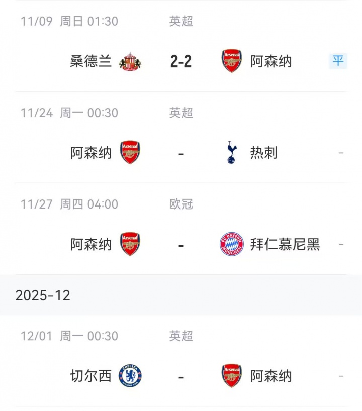 本场比赛战平后,阿森纳异日的赛程也劲敌环伺。下轮联赛,他们将在主场迎战热刺,演出“北伦敦德比”,随后在欧冠中迎战拜仁。