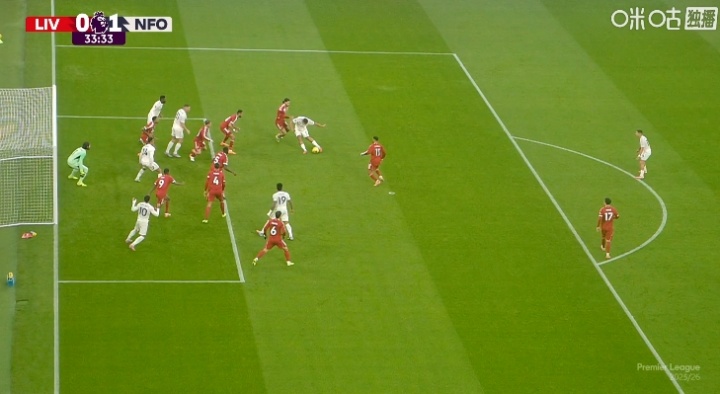 此次骚扰了吗?穆里略射门顿然,越位位置的恩多耶骚扰阿利松视野